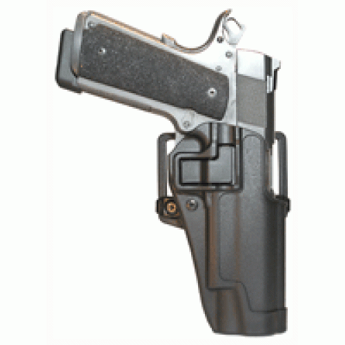 Blackhawk Serpa CQC holster perfectly fits Colt 1911 pistols for secure and rapid draw. Ideal for black colored firearms.